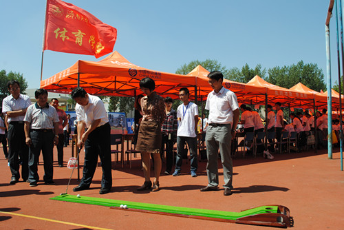 为了迎接新生而举办的特色活动。不论是以运动中人的姿态为轮廓的照片拼图展板、还是“梦想之门,踢出你的未来”以及“小小高尔夫球场”的互动,都赢得了领导的一致好评.随后在同学们的盛邀下,领导们参加了特色活动“梦想之门,踢出你的未来”以及“小小高尔夫球场”的活动。程新校长则是把自己的祝福贴在了梦想板上,并祝愿同学们的愿望都能实现。领导的关怀温暖着在场的每一个人。