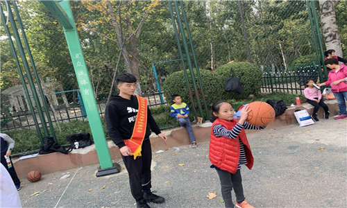 “一缕阳光”志愿服务队的志愿者们走进舜玉社区对孩子们进行篮球的基础教学。