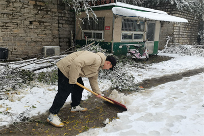 办公楼以及周边主干道路上的积雪和冰一点点地清扫干净。扫雪过程中,党支部成员及学院学生组织成员不畏严寒,积极主动、相互配合、齐心协力,挥舞着铁锹和笤帚,处处留下热火朝天的劳动场面。仅仅一个多小时的时间,原本积雪覆盖的道路,就变成了一条宽阔畅通的“安全通道”,为师生平安出行提供了便利。在略露寒意的傍晚,干净整洁的路面让每位过路的师生感到慰藉。