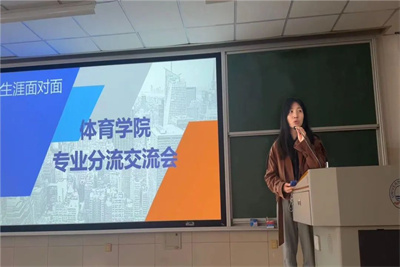 在二教召开专业分流交流会,社会体育指导与管理系主任韩继振、专业教师高赛英、20级学生代表以及2023级全部同学参加,交流会由学生工作办公室主任王梦晗老师主持。