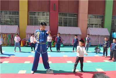 附属幼儿园后,园长向老师和同学们介绍了幼儿园孩子们的情况和注意事项,志愿者们纷纷表示将会以最大限度的调动孩子们的积极性并树立他们的自信心。他们与孩子们聊天、玩耍,并为孩子们献上了精彩的武术表演,高难度的武术动作赢得了孩子们的喝彩和掌声。他们手把手的教给孩子们简单的武术动作,在教授孩子们武术动作的同时也让孩子们了解到中国传统武术,引导孩子们初步接触和了解了中华武术传统文化,一方面可以使孩子们从小培养出以爱国主义为核心的尚武精神和武德情操;另一方面也可以加强学生们的安全防护教育,增强孩子们强身健体的意识,提高了锻炼身体的积极性,强身健体的同时还能培养孩子们的坚强意志品质,塑造完美的人格。