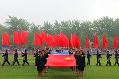 学生组成的国旗护卫队护送鲜艳的五星红旗,迈着铿锵有力的步伐走过主席台,《义勇军进行曲》的旋律环绕着济大校园的整片天空,在场的每一个人怀着对祖国无限的热爱和崇高的敬意向着国旗的方向行注目礼。威武雄姿的校旗护卫队护送校旗走过主席台,展示出他们别样的精彩,坚定的目光、沸腾的热血,显示了他们青春的风采、豪情万丈,别具一格的出场成为开幕式上一道绚丽的风景线。灿烂的笑容抒写着他们的热情,激昂的口号透露出他们的坚定,是他们让我们相信奋斗造就辉煌,是他们让我们相信心有多大,舞台就有多大。主席台下由黄色影片