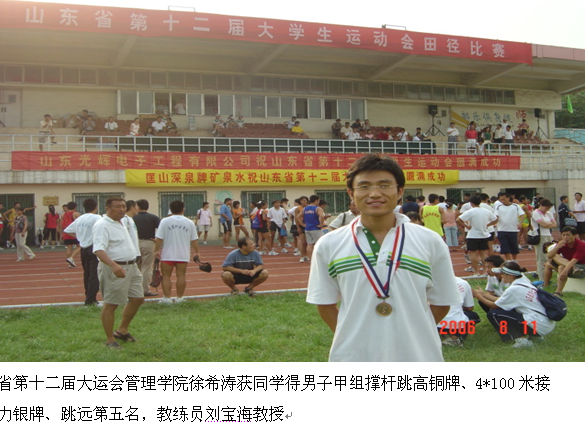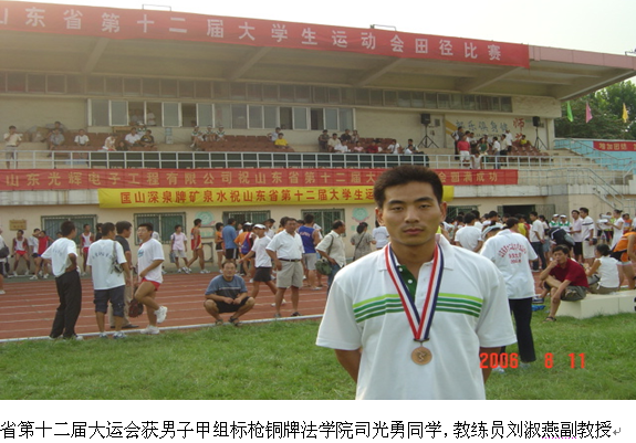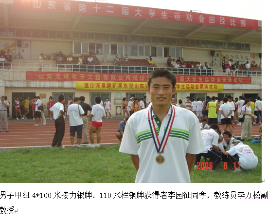 5、山东省第十二届大学生运动会文学院姜朝波获得男子甲组4*100米接力第二名,4*400米接力第八名,100米第四名,成绩10.93秒,获得男子200米第三名,成绩21.87秒,均达到国家一级运动员标准,这是我校有史以来自己培养的第一位国家一级运动员。