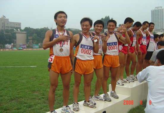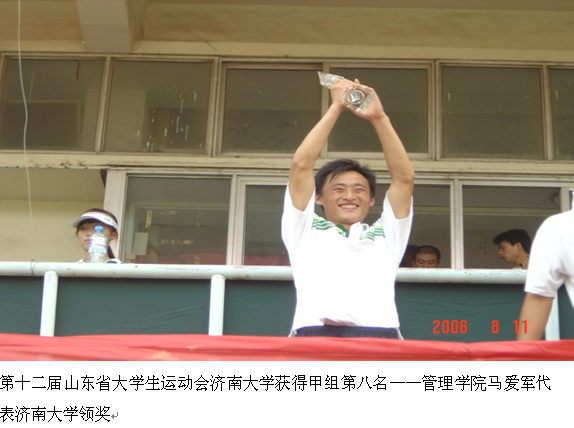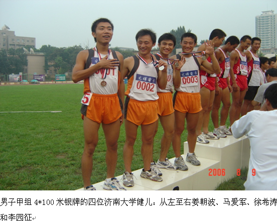 7、山东省第十二届大学生运动会管理学院马爱军获得男子甲组4*100米接力第二名,4*400米接力第八名,3000米障碍第七名。