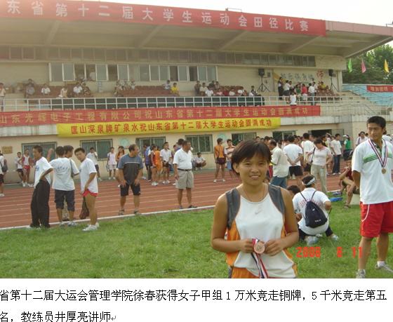 6、山东省第十二届大学生运动会社科学院马娟女子甲组400米第七名,800米第八名,4*100米接力第六名,4*400米接力第七名。