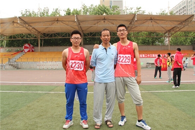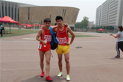 李韬同学(左一)与房高飞同学在男子甲组400m栏决赛后合影