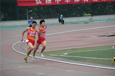 房高飞同学(右一)在男子甲组4*400m接力第3棒比赛中