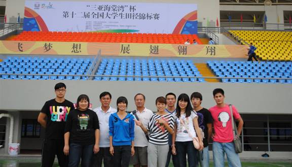 参加“三亚海棠”杯第十二届全国大学生田径锦标赛的我校教练员和运动员合影,左起:李彬、化敏、教练员李保安、马娟娟、教练员李万松、杨星、张培镯、吴甜甜、李良杰、孙浩