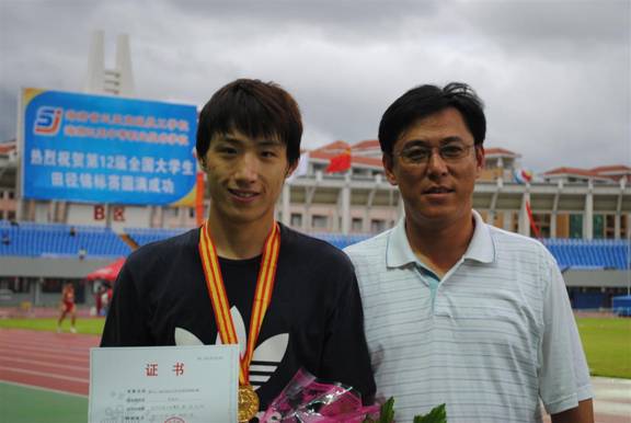 获得男子乙组跳高银牌的孙浩同学(右一)与其教练员李万松副教授合影